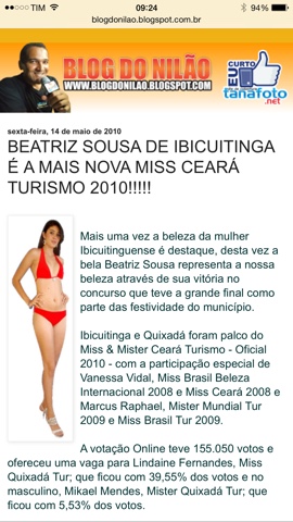 A Miss é de Ibicuitinga, Beatriz Sousa, já participou uma vez do Miss Ceará (2013) representando o Município de Morada Nova, está nesse ano voltando de novo (2015) pelo Município de Morada Nova, ai eu me pergunto: cadê as mulheres bonitas de Morada Nova? O município não valoriza sua belezas? é necessário trazer uma de fora para participar de um concurso tão importante como o Miss Ceará, quero deixar claro que não tenho nada contra, só achei estranho porque estive visitando a cidade e fiquei encantado com a beleza das mulheres de lá.
