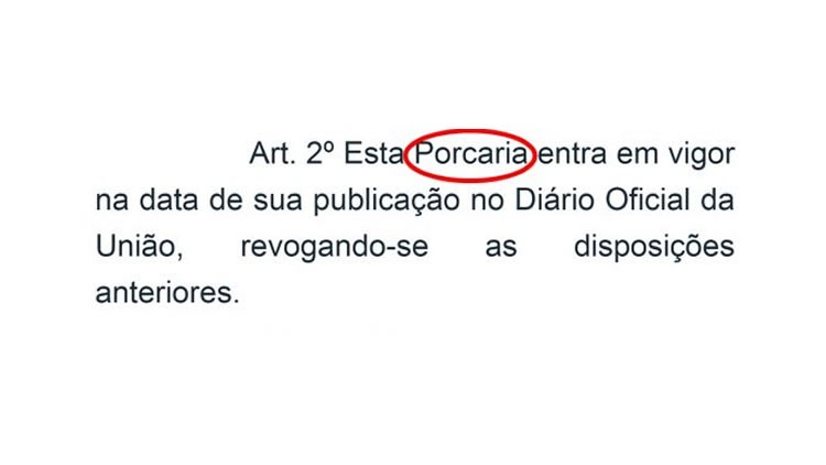 Um deslize e tanto chamou atenção da mídia nacional nesta quinta-feira, 14, quando o Diário Oficial da União publicou a palavra "porcaria" no lugar de "portaria", imagina-se. A notícia foi publicada no Correio Braziliense.