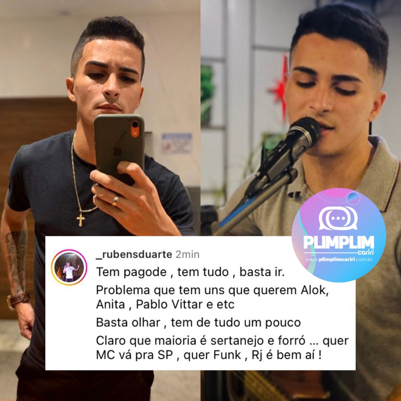 “Quer MC, vá pra São Paulo. Quer funk, RJ é bem aí” o cantor @_rubensduarte sobre a indignação de algumas pessoas pela a ausência de alguns ritmos no festival expocrato. Concordam?! 😳(reprodução: Instagram)